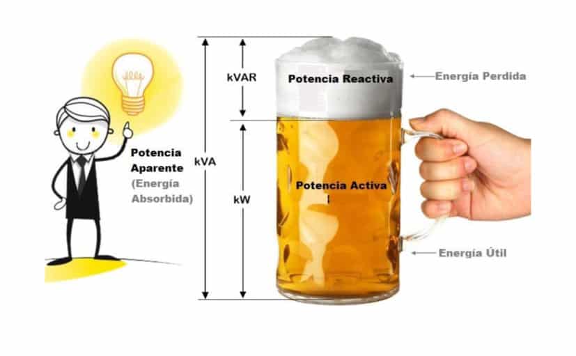 La “Potencia Aparente” es la potencia que se paga en la factura de luz a fin de mes y está compuesta por la “Potencia Activa” y la “Potencia Reactiva”. La potencia activa es la que suministra energía a los equipos y máquinas para que funcionen, mientras que la potencia reactiva hace que las corrientes que se trabajan sean más grandes que la requerida y sin generar ningún trabajo. La analogía más sencilla para entender la potencia aparente es el vaso con cerveza, donde la cerveza viene a ser la potencia activa que vamos a consumir y la potencia reactiva es la espuma que no queremos que aparezca, ambas potencias en conjunto conforman la potencia aparente, la cual sería el vaso con cerveza que debemos pagar al recibir la cuenta.